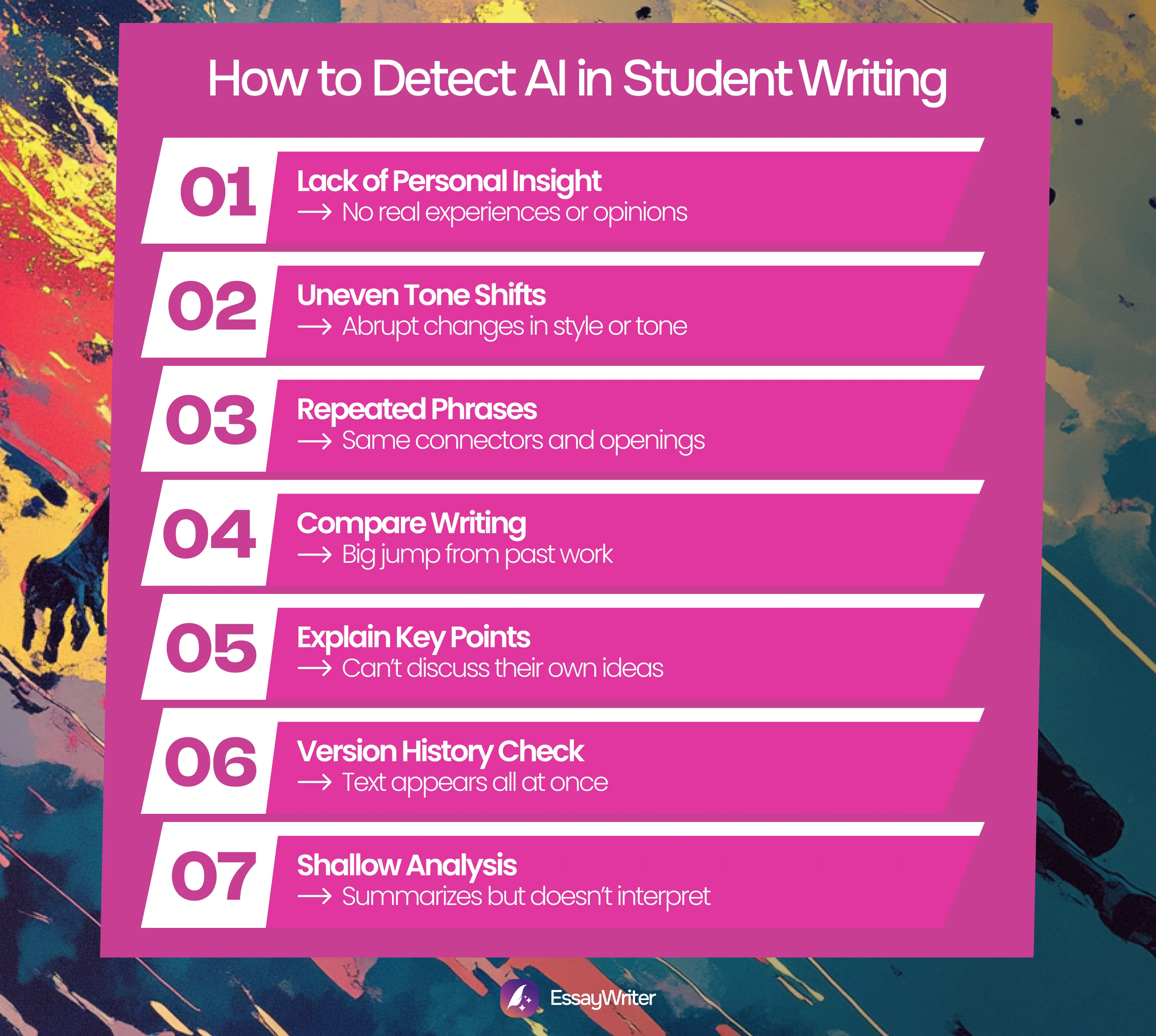Sometimes the simplest method still works best, and that is to talk to the student. When you suspect AI involvement, ask the student to explain key points of the paper. Focus on reasoning, not memory. A real writer can expand on ideas without relying on notes. They recall sources, structure, and argument flow naturally.